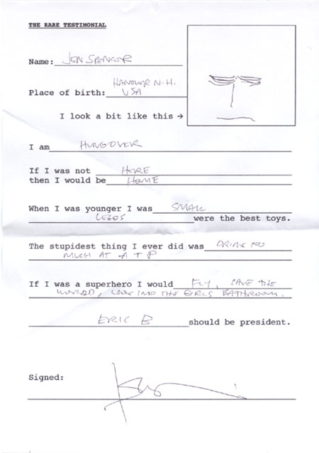 | The Rare Testimonial feature filled out by Jon Spencer. |