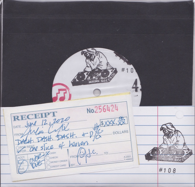 | One-sided, lathe-cut 7″ single limited to 25 numbered copies in printed brown paper bag which also includes a receipt slip and copy signed by Julie Cafritz (and Notown Records stickers and a badge).