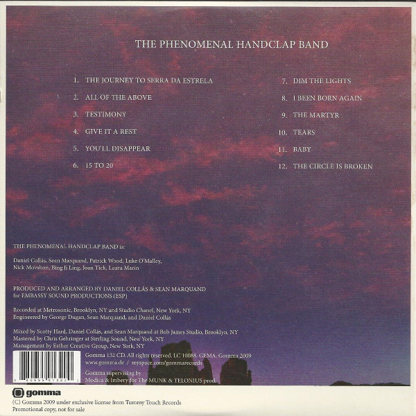 The Phenomenal Handclap Band is: Daniel Collás, Sean Marquand, Patrick Wood, Luke O’Malley, Nick Movshon, Bing Ji Ling, Joan Rick, Laura Marin Produced and Arranged: Daniel Collás & Sean Marquand for Embassy Sound Productions (ESP) Recorded at Metrosonic, Brooklyn, NY and Studio Chanel, New York, NY Mixed: Scotty Hard, Daniel Collás and Sean Marquand at Bob James Studio, Brooklyn, NY Musicians on all tracks: 01. The Journey To Serra Da Estrela 02. All of The Above 03. Testimony 04. Give It A Rest 05. You’ll Disappear 06. 15 to 20 07. Dim The Lights 08. I Been Born Again 09. The Martyr 10. Tears 11. Baby 12. The Circle Is Broken (p) The Phenomenal Handclap Band under exclusive license to Tummy Touch Records |