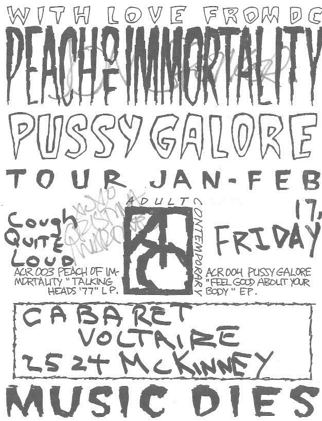 Pussy Galore show at Cabaret Voltaire, 2524 Mckinney Street, Houston, TX, 77003, US with Peach of Immortality on 17 January 1986.