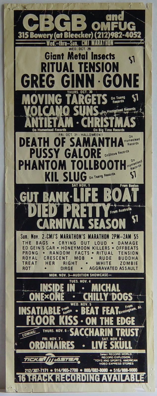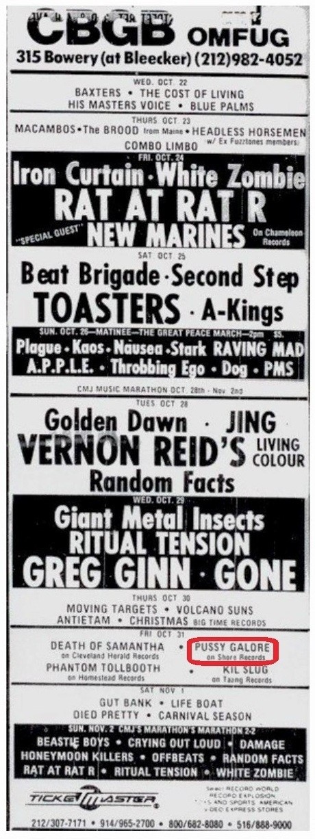 Pussy Galore show at CBGB, 315 Bowery, New York, NY, US with Death of Samantha, Phantom Tollbooth and Kil Slug on 31 October 1986.