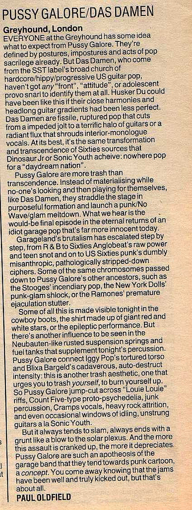 Review of the Pussy Galore and Das Damen live at the Fulham Greyhound, London, UK on 9 December 1988 from UK music weekly Melody Maker.