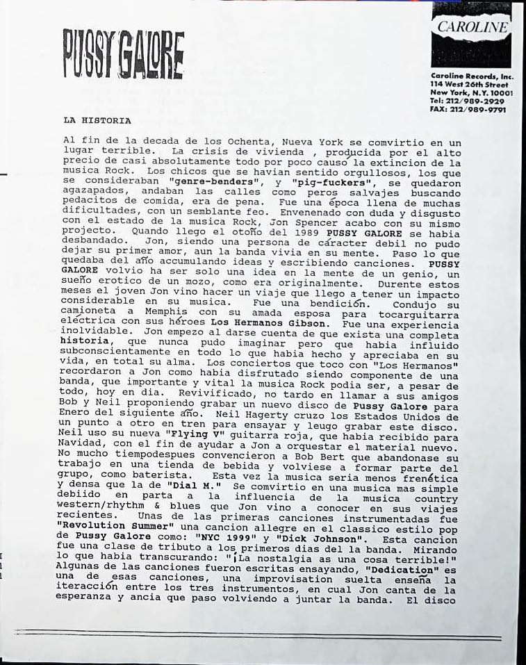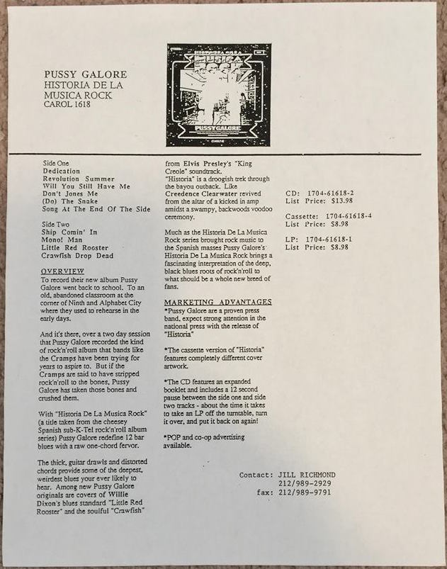 | US press release for the Pussy Galore album Historia De La Musica Rock. |