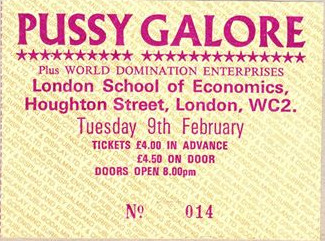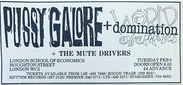 Pussy Galore show at London School of Economics, Houghton Street, London WC2A 2AE, UK with World Domination Enterprises and Mute Drivers on 9 February 1988.