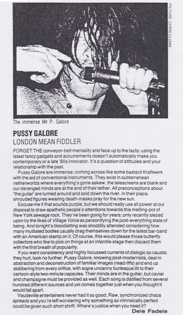 | “Pussy Galore London Mean Fiddler FORGET THE convor-belt mentality and face up to the facts: using the latest fancy gadgets and accoutrements doesn’t automatically make you contemporary or a late ’80s innovator. It’s a question of attitudes and your relationship with the past. Pussy Galore are immense; coming across like some bastard Kraftwerk with the aid of conventional instruments. They exist in subterranean netherworlds where everything’s gone askew, the telescreens are blank and our deranged minds are at the end of their tether. All preconceptions about ‘the guitar’ are turned around and sold down the river. In their place, shrouded figures wearing death-masks pray for the new sun. Excuse me if that sounds purple, but we should really use all power at our disposal to draw apathetic people’s attentions towards this melting-pot of New York sewage rock. They’ve been going for years; only recently seized upon by the likes of Village Voice as personifying the post-everything state of being. And tonight’s bloodletting was shoddily attended considering how many mutilated bodies usually drag themselves down for the latest bar-band with an American stamp on it. Of course, this would please those butterfly collectors who like to pick on things at an infantile stage then discard them with the first breath of popularity. If you want consistency and highly focussed currents of dislogic so caustic they hurt, look no further. Pussy Galore, knowing post-modernists, deal in abstraction and deconstruction of familiar images (read riffs) and end up slobbering from every orifice, with some uncanny burlesque lilt to their cartoon-style two-minute capsules. Their minds are in the gutter, but caviar and champagne must be provided as well. Each song is distilled from several hundred different sources and yet comes together just when you thought it would fall apart. Vaudeville entertainers never had it so good. Raw, synchronised chaos spreads and you’re left wondering why something so intrinsically perfect could be given such short shrift. Where’s justice when you need it? Dele Fadele” |