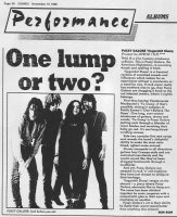 Performance One Lump or Two? Pussy Galore ‘Sugarshit Sharp’ THIS IS a 21st Century mindwarp collision. This is Pussy Galore, the American Nightmare, re-inventing thrash and spelling it trash. ‘Sugarshit Sharp’ is a frenzied cyclone of snatched sounds and influences which makes for an experiment without a conclusion or a need for one. If rock music really has nowhere else to go, the Pussy Galore are dragging it back to the rat-invested sewers, where it rightly belongs. First they butcher Einsturzende Neubauten’s ‘Yu-Gung’, if that’s possible, mixing in samples of Public Enemy’s ‘Don’t Believe The Hype’. One long, over-stated mindscrew of guitars, drums and vocals, ‘Yu-Gung’ is Pussy Galore putting rock through a blender of razor blades and watching their baby go red. It’s one long blood-curdling scream. Side two contains five new songs and reveals the band’s delightful ability to make the most miss-timed, ugliest noise around. Drums stampede in all directions; guitars fuzz Cramps-style and are castrated mercilessly and the vocals sound like they’ve been dragged backwards through a loudhailer. And yet, Pussy Galore are steeped in rock ‘n’ roll tradition; they have just chosen to disfigure their heritage. ‘Sugarshit Sharp’ verges on the absurd – a place where Pussy Galore obviously like to hang out. The noise has been stitched together by sonic surgeons with a masochistic glee in their eyes and machetes as needles. Pussy Galore’s art is their ability to make their worst sound better than anything else around. Ron Rom.” |