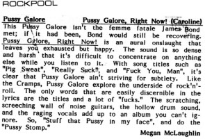 | “Pussy Galore Pussy Galore, Right Now (Caroline) This Pussy Galore isn’t the femme fatale James Bond met; if it had been, Bond would still be recovering. Pussy Galore, Right Now! is an aural onslaught that leaves you exhausted by happy. The sound is so dense and harsh that it’s difficult to concentrate on anything else while you listen to it. With song titles such as “Pig Sweat”, “Really Suck”, and “Fuck You, Man”, it’s clear that Pussy Galore ain’t striving for subtlety. Like the Cramps, Pussy Galore ain’t striving for subtlety. Like the Cramps, Pussy Galore explore the underside of rock ‘n’ roll. The only words that are easily discernible in the lyrics are the titles and a lot of “fucks.” The scratching, screeching wall of noise guitars, the hollow drum sound, and the raging vocals add up to an album you can’t ignore. So, “Stuff that Pussy in my face”, and do the “Pussy Stomp.” Megan McLaughlin” |