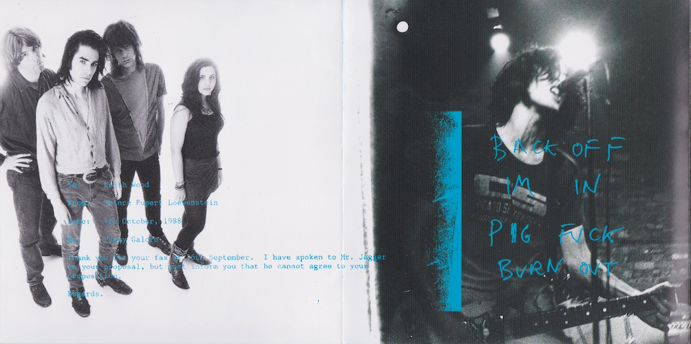 “To: Keith Wood From: Prince Rupert Loewenstein Date: 4th October, 1988 Re: Pussy Galore Thank you for your fax of 26th September. I have spoken to Mr. Jagger re your proposal, but must inform you that he cannot agree to your proposition. Regards,” [CENTRE IMAGE: Black and white image of Jon Spencer with the text:] |