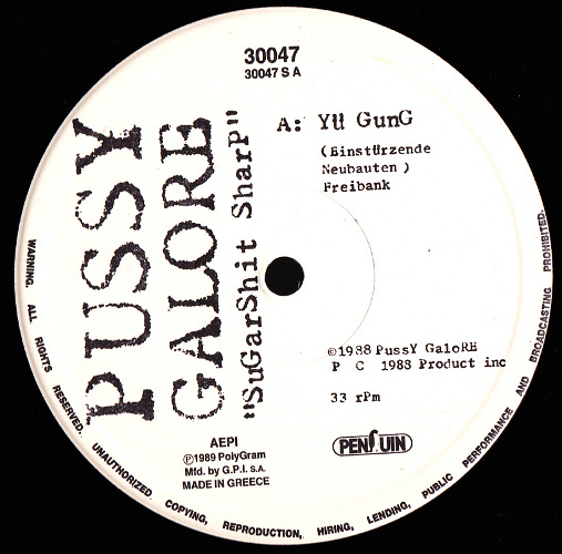 There is a problem with the sleeve of the Greek edition of the LP as other copies also have the same type of brown marks on the cover. *exact release date unknown. The UK release has the original Caroline catalogue number lightly crossed-out and the MPROD catalogue number added to the disc. The Greek version features the “30047” Penguin catalogue number in addition to the (crossed-out) Caroline and MPROD engravings. For the cover artwork Pussy Galore “wanted the Rolling Stones lips logo on the cover but Caroline Records got cold feet, permission was sought and, after a month or two, “Prince Rupert or someone or other sent a message – ‘Mr Jagger says no’, ‘So the cover’s now a carve-up inferno between the lips and Neubauten’s symbol so “we won’t get sued for it…But, if we did get sued, it would be great!” – Melody Maker: Insanity Claws (PRESS, UK) The original intended artwork was included as a sticker with the Japanese release on Supernatural Organization and appears on the rear sleeve of the bootleg 7″ single Love You Live. In 1998 Mute / Matador reissued Right Now!, Sugarshit Sharp and Dial ‘M’ for Motherfucker on both vinyl (with Posters) and CD. Matador Records issued a promo only Pussy Galore Sampler featuring tracks from all three albums. This release features a cover of Einstürzende Neubauten (Yü-Gung, released as a 12″ single). |