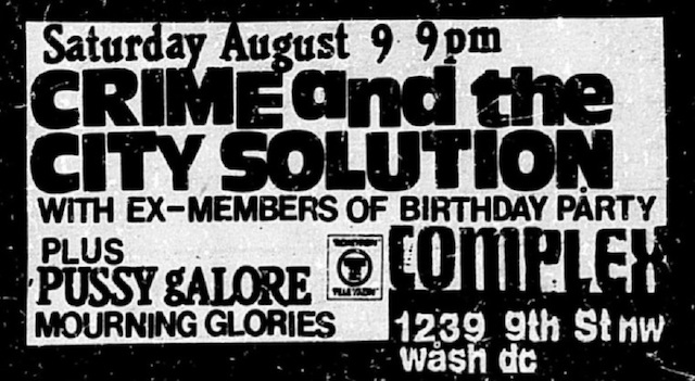 Pussy Galore show The Complex, 1239 9th Street, NW Washington, DC, US with Crime and The City Solution and The Mourning Glories on 9 August 1986.