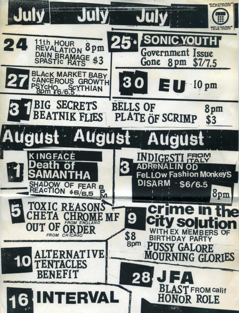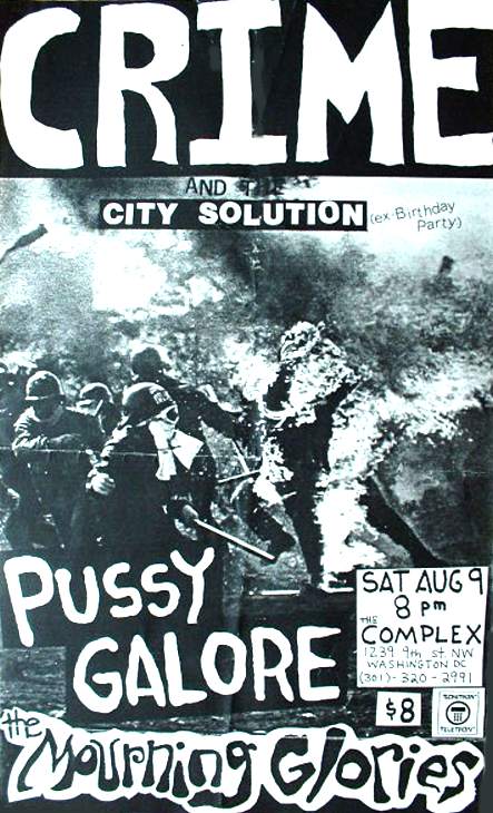 Pussy Galore show The Complex, 1239 9th Street, NW Washington, DC, US with Crime and The City Solution and The Mourning Glories on 9 August 1986.