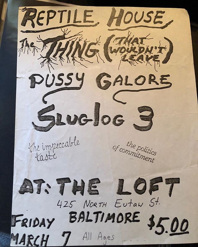 Pussy Galore show at The Loft, 425 Eutaw Street, Baltimore, MD, US with Reptile House, The Thing (That Wouldn’t Leave) and Sluglog 3 on 7 March 1986.