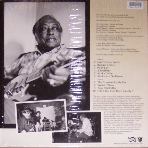 | “There isn’t a man in town with good sense who’d try to argue with Robert Palmer about chaos. “Chaos, chance, charm and luck are a primary Blues paradigm, of course, and a late-twentieth-century scientific paradigm as well. The Chaos Theory of post-relativity psychics tells us of Strange Attractors – inexplicable higher order functions that provide a kind of boundary or shape or structural dynamic for chaotic systems – and this fits R.L. as well. The essential character of R.L.’s is chaos-on-wheels; spreading sonic waves of sex and mayhem around our planet.” R.L.’s a Strange Attractor. he’s a .999 fine. 24 karat. 180 proof. 100% pure-Higher-Order function. He’s what’s needed; and it’s about time. We need a man we can count on. count on to yell fire in a crowded theater, wave a pistol in a crowded juke.”He’s the Blues walking like a man: the living personification of a guitar moan and a back door slam.” R.L. doesn’t have time for any nonsense; his plate is full. So. close your eyes. put your arms in front of your face (if you still care) and prepare to be Burnsided into stark oblivion by A Ass Pocket Of Whiskey.” “Special Thanks – Helen, Jay, Marty, Dale, Peter, Lori, Chris, Boche, Gibson Guitars” |