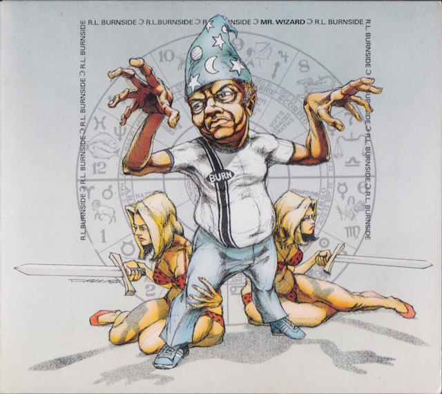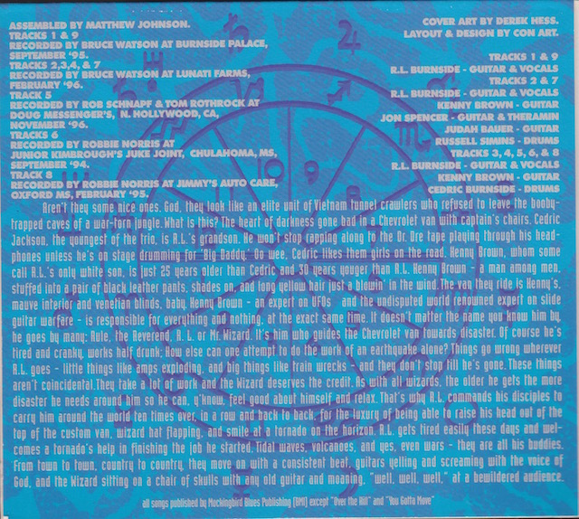 | “Aren’t they some nice ones. God, they look like an elite unit of Vietnam tunnel crawlers who refused to leave the booby-trapped caves of a war-torn jungle. What is this? The heart of darkness gone bad in a Chevrolet can with captain’s chairs. Cedric Jackson, the youngest of the trio, is R.L.’s grandson. He won’t stop rapping along to the Dr. Dre tape playing through his headphones unless he’s on stage drumming for ‘Big Daddy’. Oo wee, Cedric likes them girls on the road. Kenny Brown, whom some call R.L.’s only white son, is just 25 years older than Cedric and 30 years younger than R.L. Kenny Brown – a man among men, stuffed into a pair of black leather pants, shades on, and long yellow hair just a blowin’ in the wind. The van they ride is Kenny’s. Mauve interior and venetian blides, baby. Kenny Brown – an expert on UFO’s and teh undisputed world renowned expert on slide guitar warfare – is responsible for everything and nothing, at the exact same time. It doesn’t matter the name you know him by, he goes by many: Rule, The Reverend, R.L. or Mr Wizard. It’s him who guides the Cevrolet van towards disaster. Of course he’s tired and cranky, works half drunk; How else can one attempt to do the work of an earthquake alone? Things go wrong wherever R.L. goes – little thinghs like amps exploding, and big things like train wrecks – and they don’t stop until he’s gone. These things aren’t coincidental. They take a lot of work and the Wizard deserves the credit. As with all wizards, the older he gets the more disaster he needs around him so he can, y’know, feel good about himself and relax. That’s why R.L. commands his disciples to carry hum around the world ten times over, in a row and back to back, for the luxury of being able to raise his head out of the top of the custom van, wizard hat flapping, and smile at a tornado on the horizon. R.L. gets tired easily these days and welcomes a tornado’s help in finishing the job he started. Tidal waves, volcanos, and yes, even wars – they are all his buddies. From town to town, country to country, they move on with a consistent beat, guitars, yelling and screaming with the voice of God, and the Wizard sitting on a chair of skulls with any old guitar and moaning, “well, well, well,” at a bewildered audience.” | |