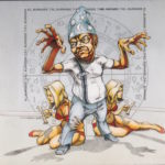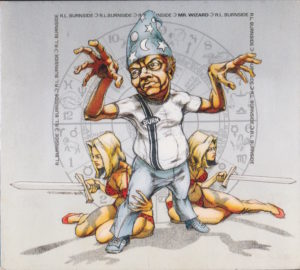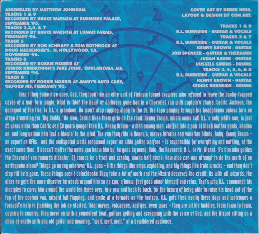 “Aren’t they some nice ones. God, they look like an elite unit of Vietnam tunnel crawlers who refused to leave the booby-trapped caves of a war-torn jungle. What is this? The heart of darkness gone bad in a Chevrolet can with captain’s chairs. Cedric Jackson, the youngest of the trio, is R.L.’s grandson. He won’t stop rapping along to the Dr. Dre tape playing through his headphones unless he’s on stage drumming for ‘Big Daddy’. Oo wee, Cedric likes them girls on the road. Kenny Brown, whom some call R.L.’s only white son, is just 25 years older than Cedric and 30 years younger than R.L. Kenny Brown – a man among men, stuffed into a pair of black leather pants, shades on, and long yellow hair just a blowin’ in the wind. The van they ride is Kenny’s. Mauve interior and venetian blides, baby. Kenny Brown – an expert on UFO’s and teh undisputed world renowned expert on slide guitar warfare – is responsible for everything and nothing, at the exact same time. It doesn’t matter the name you know him by, he goes by many: Rule, The Reverend, R.L. or Mr Wizard. It’s him who guides the Cevrolet van towards disaster. Of course he’s tired and cranky, works half drunk; How else can one attempt to do the work of an earthquake alone? Things go wrong wherever R.L. goes – little thinghs like amps exploding, and big things like train wrecks – and they don’t stop until he’s gone. These things aren’t coincidental. They take a lot of work and the Wizard deserves the credit. As with all wizards, the older he gets the more disaster he needs around him so he can, y’know, feel good about himself and relax. That’s why R.L. commands his disciples to carry hum around the world ten times over, in a row and back to back, for the luxury of being able to raise his head out of the top of the custom van, wizard hat flapping, and smile at a tornado on the horizon. R.L. gets tired easily these days and welcomes a tornado’s help in finishing the job he started. Tidal waves, volcanos, and yes, even wars – they are all his buddies. From town to town, country to country, they move on with a consistent beat, guitars, yelling and screaming with the voice of God, and the Wizard sitting on a chair of skulls with any old guitar and moaning, “well, well, well,” at a bewildered audience.”