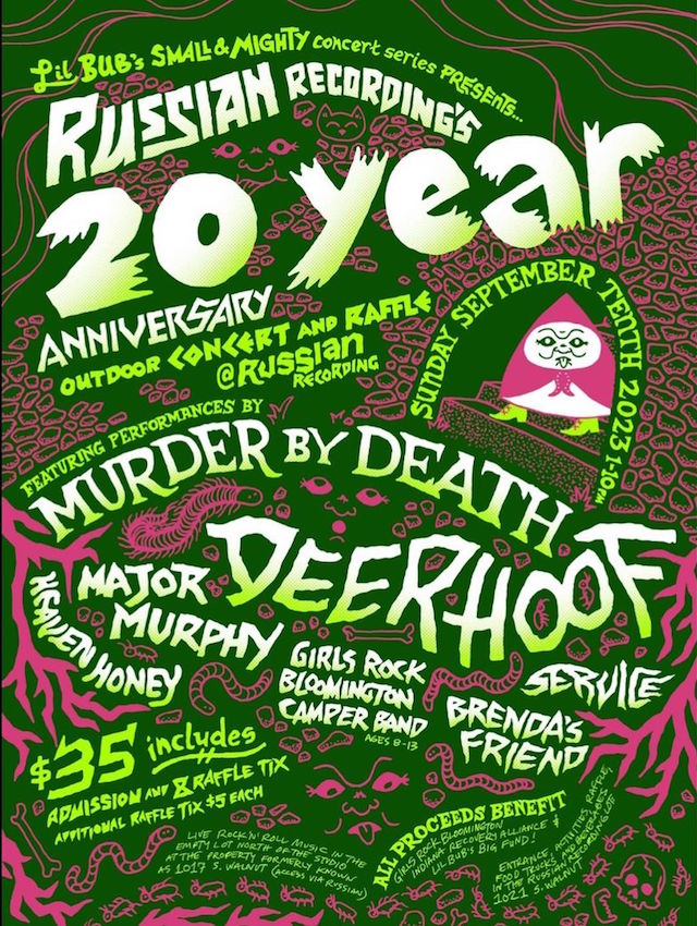 Girl’s Rock Camp Band (ages 8-13)The Russian Recording 20 Year Anniversary is an exceptional outdoor family-friendly fundraising event taking place in the Russian Recording parking lot located at 1021 S. Walnut St in Bloomington, IN. Every admission ticket comes also comes with a fixed amount of raffle tickets (see details below) for a chance to win one or more incredible prizes including free recording studio time, gift certificates to your favorite Bloomington businesses, and more. Guests can also purchase food and beverage tickets that can be used at local food food trucks and to buy local beer and mixed drinks. 100% of the net proceeds from all admission, raffle, food, and beverage sales benefit local charities (see more info below).