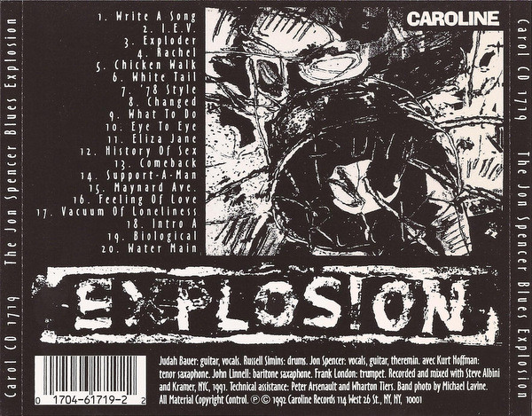 Guitar/Vocals: Judah Bauer Drums: Russell Simins Vocals/Guitar/Theremin: Jon Spencer Tenor Saxophone: Kurt Hoffman Recorded and Mixed with Steve Albini and Kramer, NYC, 1991 [Credits given here are taken from the Shout! Factory compilation Year One (CD, US)] 01. Write A Song 02. I.E.V. 03. Exploder 04. Rachel 05. Chicken Walk 06. White Tail 07. ’78 Style 08. Changed 09. What To Do 10. Eye To Eye 11. Eliza Jane 12. History Of Sex 13. Comeback 14. Support-A-Man 15. Maynard Ave. 16. Feeling Of Love 17. Vacuum Of Loneliness 18. Intro A 19. Biological 20. Water Main |