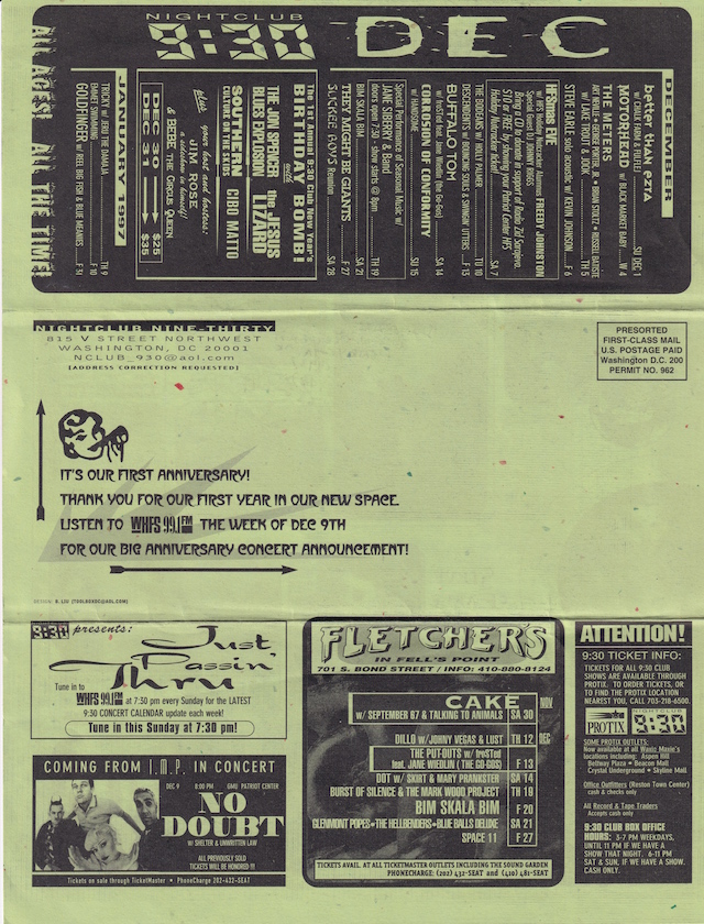 The Jon Spencer Blues Explosion sets at 9:30 Club, Washington, DC, US with Cibo Matto, The Jesus Lizard and Southern Culture on The Skids on 30 and 31 December 1996.