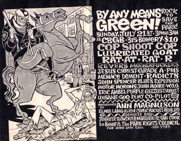 “By Any Means Green!” benefit show with Cop Shoot Cop, Lubricated Goat, Rat.At.Rat.R, Reverb Motherfuckers, Jesus Christ, Grade A, PMS, Menace Dement, Radicts, Motor Morons, John Moore, W.O.O., Eric Ambel, Purple Geezus, Thrust, Unsane, God is My Co-Pilot with Performances by Ann Magnuson, Elmer Lang, Alien Comic, Rockets Redlarge and emcee’s Jennifer Blowdryer and Marguerite Van Cook.