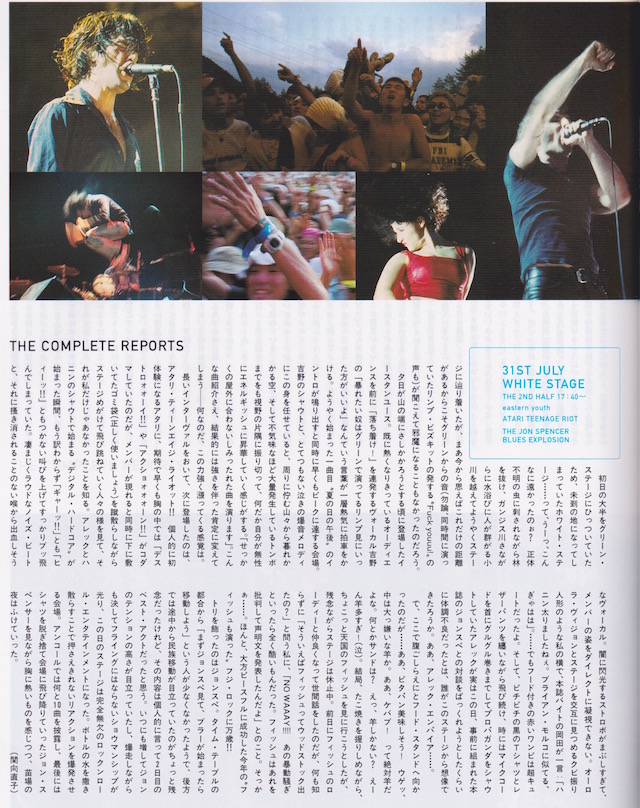 “The final act was Jon Spencer. Due to the timetable, it seemed like many people decided to watch Jon Spencer first and then move on when Blur started, which was a bit disappointing as people started moving from one place to another in the back. Personally, I think the performance was the best of the second day. Jon’s energy was more intense than usual, and his showmanship, which was undeniable despite his explosive speed and never going off the rails, shone through. The stage that day was a perfect example of rock ‘n’ roll entertainment. The audience erupted in uncontrollable reactions as they scattered bottled water. For the encore, Jon Spencer performed a whopping 10 songs, and at the end, he took off his shirt and jumped into the venue. Watching him do so brought a warm feeling to my heart as the night in Naeba drew on. (Sekimuki Naoko)”