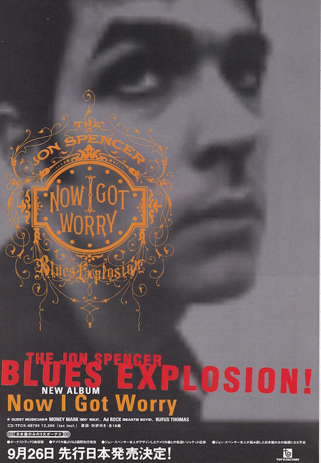 | Japanese poster and magazine advert for the release of The Jon Spencer Blues Explosion album Now I Got Worry.Featuring the logo/lettering from the album sleeve by Jeanne Greco.