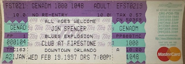 The Jon Spencer Blues Explosion show at The Club @ Firestone, 578 N. Orange Avenue, Orlando, Florida, US with Subsonics and Speedball Baby on 19 February 1997.
