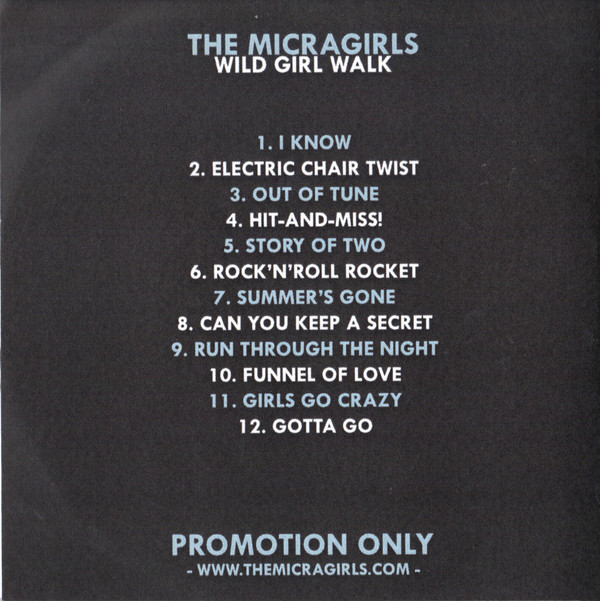 | The Micragirls: Guitar / Vocals: Mari Halonen Keyboards / Bass Organ / Backing Vocals: Katarina Haapalainen Drums / Backing Vocals: Kristina Haapalainen Recorded: 2009 at Altai, Helsinki, Finland 01. I Know 02. Electric Chair Twist 03. Out Of Tune 04. Hit-And-Miss! 05. Story of Two 06. Rock’n’Roll Rocket 07. Summer’s Gone 08. Secret 09. Run Through The Night 10. Funnel of Love 11. Girls Go Crazy 12. Gotta Go p+c 2009, Bone Voyage Recording Company |
