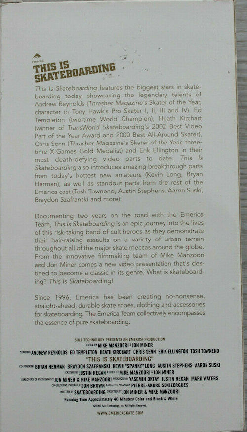 “This Is Skateboarding features the biggest stars in skateboarding today, showcasing the legendary talents of Andrew Reynolds (Thrasher Magazine’s Skater of the Year, character inTony Hawk’s Pro Skater I, II, III and IV), Ed Templeton (two-time World Champion), Heath Kirchart (winner ofTransWorld Skateboarding’s 2002 Best Video Part of the Year Award and 2000 Best All-Around Skater), Chris Senn (Thrasher Magazine’s Slater of the Year, three-time X-Games Gold Medalist) and Erik Ellington in their most death defying video parts to date. This Is Skateboarding also introduces amazing breaking through parts from today’s hottest new amateurs (Kevin Long, Bryan Herman), as well as standout parts from the rest of the Emerica cast (Tosh Townend, Austin Stephens, Aaron Suski, Braydon Szafranski and more).