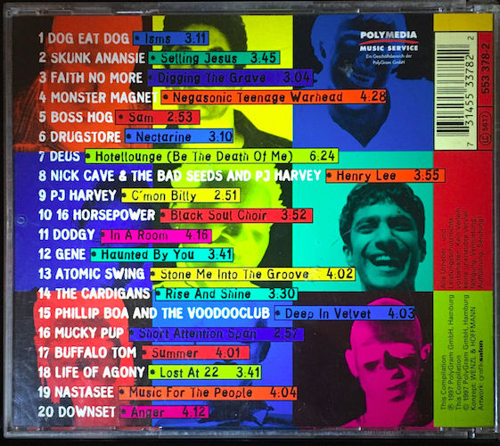 01. Dog Eat Dog – Isms 02. Skunk Anansie – Selling Jesus 03. Faith No More – Digging The Grave 04. Monster Magnet – Negasonic Teenage Warhead 05. Boss Hog – Sam 06. Drugstore – Nectarine 07. Deus – Hotellounge 08. Nick Cave feat. PJ Harvey – Henry Lee 09. PJ Harvey – C´mon Billy 10. 16 Horsepower – Black Soul Choir 11. Dodgy – In A Room 12. Gene – Haunted By You 13. Atomic Swing – Stone Me Into The Groove 14. The Cardigans – Rise And Shine 15. Philip Boa – Deep In Velvet 16. Mucky Pup – Short Attention Span 17. Buffalo Tom – Summer 18. Life Of Agony – Lost At 22 19. Nastasee – Music For The People 20. Downset – Anger |