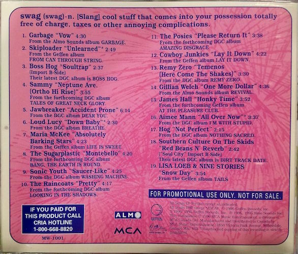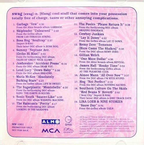 | Canadian version of the Swag compilation issued in regular plastic case featuring a slightly different track listing and given away by Music World stores in Canada. Soul Trap by Boss Hog appears as a B-Side on the I Dig You single from their 1995 Geffen album. | |
