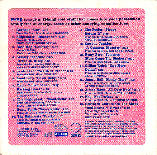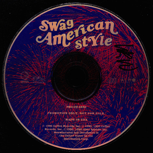 COVER: “Swag American Style, PRO-CD-4850” REAR: Text as in ‘Song Credits’ and ‘Sleeve Notes’, Tracklisting and the following text; “All songs LP Version except as indicated. All songs BMI *ASCAP. Geffen Records/DGC/Almo Sounds. Manufactured and distributed in the United States by Uni Distribution Corp. © 1996 Geffen Records, Inc. (p) 1996, 1995 Almo Sounds Inc. All Rights Reserved. Unauthorized duplication is a violation of applicable laws. PRO-CD-4850 DISC: “PRO-CD-4850 © 1996 Geffen Records, Inc. (p) 1996, 1995 Geffen Records, Inc. (p) 1996, 1995 Almo Sounds, Inc. Manufactured and distributed in the United States by Uni Distribution Corp.” |