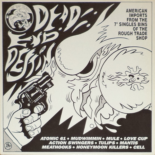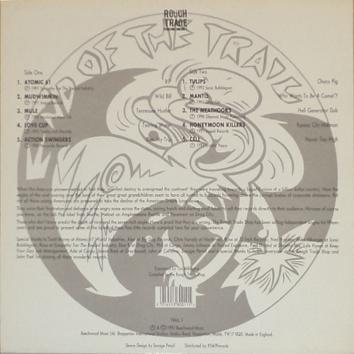 When the American pioneers set out to find their ‘manifest destiny to over spend the continent’ they were travelling towards a hopeful vision of a billion dollar country. Now the eagles of the west soaring over the land of their great great grandchildren seem to have all turned to buzzards hovering above the corrupt bodies of corporate dinosaurs. But not all these young Americans are prepared to take the decline of the American Dream lying down. They voice their frustration and defiance in an angry noise across the states, joining hands and starting small labels to sell their records directly to their audience. Nirvana of course you know, on the Sub Pop label from Seattle, Helmet on Amphetamine Reptile and Pavement on Drag City. Those who don’t know predict the death of vinyl and the seven-inch single. Here is proof that they are wrong. The Rough Trade Shop has been selling independent singles for fifteen years and are proud to present some of the latest of these fine little records compiled here for your convenience. Special thanks to Todd Morey at Atomic 61 World Industries, Alex at Big Dog Records, Chris Varady at Nocturnal, Rose at 12 Inch Records, Ned Hayden, Mike Hibarger at Sonic Bubblegum, Rose at Sympathy For The Record Industry, Dan K at Drag City, Phil at Cargo, Jimmy Johnson at Forced Exposure, Paul Dordal at Disastro Mix, Lyle Hysen at Keep Your Day Job Management, Ada at Cargo, Simon Rock at Greyhound, John at Caroline, Savage Pencil and a special thanks to Judith, everyone at Rough Trade Shop and John Peel for playing all these wonderful records.” Design by Savage Pencil COVER: American imports from the 7″ singles bins of the Rough Trade Shops [also lists artists]. |