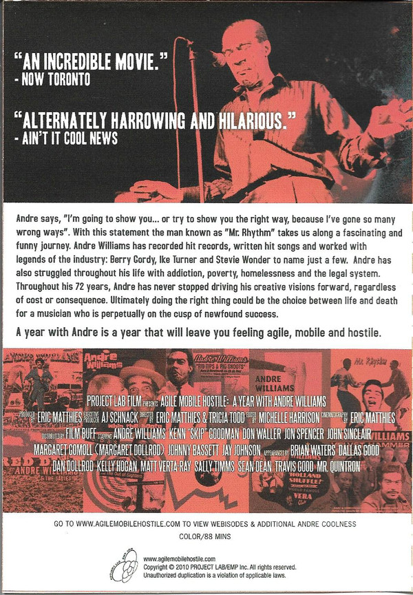 | DVD edition of Agile, Mobile, Hostile: A Year With Andre Williams issued as a DVDR (manufactured on demand) and available via agilemobilehostile.com.