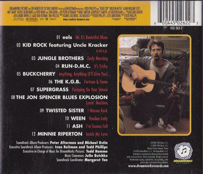 “Dreamworks Pictures and The Montecito Picture Company present an Ivan Reitman production. A Todd Phillips film “Road Trip” Breckin Meyer, Seann William Scott, Amy Smart, Rachel Blanchard with Fred Ward and Tom Green. Music Supervisor Peter Afterman, Music By Mike Simpson, Costume Designer Peggy Stamper, Film Editor Sheldon Kahn, A.C.E., Production Engineer Clark Hunter, Director of Photography Mark Irwin, C.S.C./A.S.C., Executive Producers Ivan Reitman Tom Pollock, Produced by Daniel Goldberg Joe Medjuck, Written by Todd Phillips & Scott Armstrong, Directed by Todd Phillips. www.roadtrip-themovie.com” DISC: “Music From The Motion Picture Road Trip. © 2000 SKG Music L.L.C. Motion Picture Artwork, Photos © 2000 DreamWorks L.L.C., TM DreamWorks L.L.C. DreamWorks Records. All Rights Reserved. Manufactured and distributed in Canada by Universal Music. Unauthorized reproduction, copying and rental of this recording is prohibited by law. 0044-50262-2.” REAR: “www.universalcanada.com |