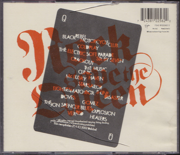 BOOKLET: As given in ‘Song Credits’ and the following text; “Rock Save The Queen, Supercharged Rock Tunes, Delabel©MMII, Jerome Coste © MMII, 7243 8122562 2”. DISC: “All rights of the producer and the owner of the work reproduced reserved, unauthorised copying, hiring, lending, public performance and broadcasting of this record prohibited. 03098. Made in the EU. 7243 8122562 2. Compilation (p) 2002 Delabel [and Bel BIEM, Delabel, Compact Disc logos].” REAR: Artists, Barcode and the following text; “All rights reserved. Unauthorised copying, hiring, lending, public performance, and broadcasting prohibited. This compilation (p) & © 2002 Delabel. Virgin 7243 8122562 2, PM 502 Printed in the EU. Diffusion exclusive Virgin France SAS”. |