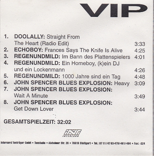 | 01. Doolally – Straight From The Heart (Radio Edit) 02. Echoboy – Frances Says The Knife Is Alive 03. Regenundmild – Im Bann des Plattenspielers 04. Regenundmild – Ein Homeboy (k)ein DJ und ein Lockenmann 05. Regenundmild – 1000 Jahre sind ein Tag 06. Jon Spencer Blues Explosion – Heavy 07. Jon Spencer Blues Explosion – Wait A Minute 08. Jon Spencer Blues Explosion – Get Down Lover |