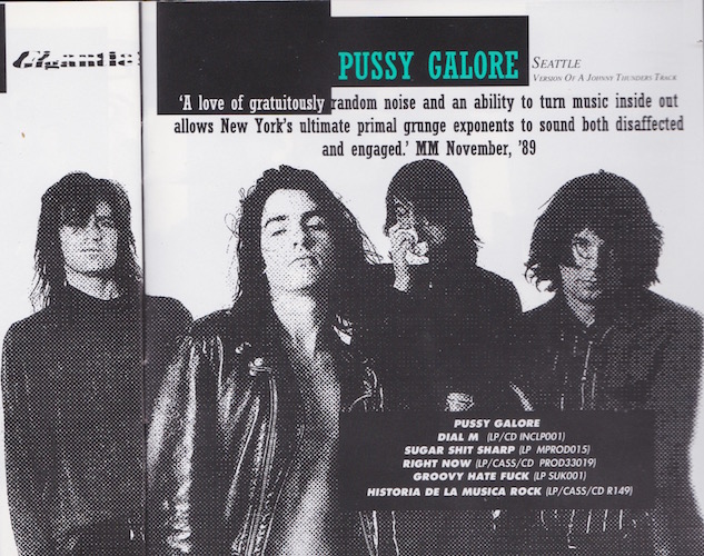 Includes the song Seattle by Pussy Galore which was released as a bootleg 7″. Seattle is a re-located cover of London Boys by Johnny Thunders from the album So Alone and was officially released on the Melody Maker compilation Gigantic 2. |
