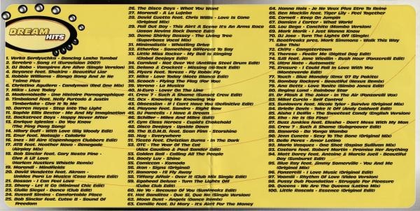 001. Verka Serduchka – Dancing Lasha Tumbai 002. Serebro – Song #1 (Eurovision 2007) 003. DJ BoBo – Vampires Are Alive (Single Version) 004. Beyonce feat. Shakira – Beautiful Liar 005. Robbie Williams – Bongo Bong And Je Ne T’aime Plus 006. Christina Aguilera – Candyman (RedOne Mix) 007. MIKA – Love Today 008. Mademoiselle – Une Histoire Pornographique 009. Timbaland feat. Nelly Furtado & Justin Timberlake – Give It To Me 010. Darren Hayes – Step Into The Light 011. Sophie Ellis Bextor – Me And My Imagination 012. Backstreet Boys – Happy Never After 013. Enrique Iglesias – Do You Know? (The Ping Pong Song) 014. Hilary Duff – With Love (Big Woody Edit) 015. ENUR feat. Natasja – Calabria 016. Inez – Mi Aire (Copenhagen Clubbers Edit) 017. ATB feat. Heather Nova – Renegade (Airplay Mix) 018. Bob Sinclar feat. Gary Nesta Pine – Give A Lil’ Love (Harlem Hustlers Whistle Remix) 019. MoRanDi – Mind Fields 020. David Vendetta feat. Akram – Unidos Para La Musica (Cosa Nostra Edit) 021. Bosson – I Can Feel Love 022. Dhany – Let It Go (Minimal Chic Edit) 023. Giulia Siegel – Dance! (Club Edit) 024. Russell Simins – Comfortable Place 025. Bob Sinclar feat. Cutee B – Sound of Freedom 026. The Disco Boys – What You Want 027. MoRanDi – A La Lujeba 028. David Guetta feat. Chris Willis – Love Is Gone (Original Mix) 029. Fall Out Boy – This Ain’t A Scene, It’s An Arms Race (Jason Nevins Rock Dance Edit) 030. Dame Shirley Bassey – The Living Tree (Superbass Vocal Mix) 031. Minimalistix – Whistling Drive 032. Etherfox – Something Different To Say 033. Little Miss Rocker – My Bell Is Ringing (Global Deejays Edit) 034. Carnival – Not Over Yet (Antillas Steel Drum Edit) 035. Delano & Crockett – Missing (Hi-Tack Remix) 036. Flyers feat. Tereza – Fly Robin Fly 037. MIKA – Love Today (Moto Blanco Edit) 038. Scooch – Flying The Flag (For You) 039. Verona – La Musica 040. N-Euro – Lover On The Line 041. Crew 7 – Such A Shame (Sunset Crew Edit) 042. DCX – Knowing Me, Knowing You 043. Obsession – If I Can’t Have You (Definitive Edit) 044. Playone feat. Sandra – Right Now 045. DJ Pantelis – I Have A Dream 046. Schiller – Miles And Miles (Edit) 047. Gym Class Heroes – Cupid’s Chokehold 048. Disco Deejays – Upside Down 049. The B.O.M.B. feat. Sean Finn – Starshine 050. Hug – Everywhere 051. Tiesto feat. Christian Burns – In The Dark 052. OTC – The Year Of The Cat (Alex Gaudino & Paulsander Edit) 053. Golden Ball – Calling All The People 054. Booty Luv – Shine 055. Comiccon – Komodo 056. Ikon – Signs (Original) 057. Banaroo – I’ll Fly Away 058. Tiffany Affair – Over It (Club Mix Single Edit) 059. Egohead Deluxe – Turn The Lights Off (Cuba Club Edit) 060. Ne Yo – Because of You (Sunfreakz Edit) 061. Hot Banditoz – Que Si, Que No (Single Version) 062. Moon Dust – Angels (Dance Remix) 063. Camille – It Ain’t For The Money 064. Hanna Hais – (Je Ne Veux Plus Être) Ta Reine 065. Ben Macklin feat. Tiger Lily – Feel Together 066. Corenell – Keep On Jumping 067. Damien J. Carter – What World 068. Lou Bega – Conchita (Mambo Version) 069. Mark Marik – I Just Wanna Know 070. DJ Jose – Turn The Lights Off (Single) 071. BeatFreakz Pres. Mark Simmons – Walk This Way (Like This) 072. Ch!pz – Gangstertown 073. Therese – Feelin’ Me (Digital Dog Edit) 074. SJB Feat. Jane Wiedlin – Rush Hour (Fonzerelli Edit) 075. Ultra Nate – Automatic 076. Erasure – I Could Fall In Love With You (Monteverde Edit) 077. 2 Touch – Blue Monday (Rmx’07 By Pakito) 078. Bombay Rockers – Beautiful (Nexus Remix) 079. Ana Bettz – Love Tonite (Bimbo Jones Edit) 080. Regina Lund – Rainbow Star 081. Dr. Flash & The Joker – In The Air Tonight (Fonzerelli Vox) 082. Mikel Curcio – Self Control 083. Sunloverz feat. Nicole Tyler – Survive (Original Mix) 084. Brielle Davis – Take It Off (Andy Caldwell Edit) 085. Aisha I Delfin – The Sweetest Candy (English Version) 086. Eha – He Is (So Fine) 087. Buzz Junkies feat. Elesha – Don’t Mess With My Man 088. Crew 7 – Such A Shame (Subgroover Edit) 089. Banaroo – Ba Yonga Wamba 090. Jenn Cuneta – Sexy To The Bone (Original Mix) 091. Belle Perez – Amor Latino 092. Mario Vasquez – One Shot (Ospina Sullivan Mix) 093. CoStarz feat. Robert Martin – Promise Her Anything 094. Matt Darey feat. Antoine & Marcia Juell – Beautiful Day (Sunburst Edit) 095. Blue Ray feat. Jimmy Somerville – You & Me (Original Mix) 096. Fonzerelli – I Love Music (Original Edit) 097. Yoomiii – Rhythm Of Love (Video Version) 098. Pussy Dub Foundation – Struggle For Pleasure 099. Queens – We’re The Queens (Latino Mix) 100. Little Rascals – Essence (Original Edit) |