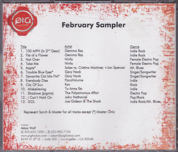 | Promotional CD for film, TV and advertising music licensing company Pig Factory featuring Aapie from the Solex vs Cristina Martinez + Jon Spencer album Amsterdam Throwdown King Street Showdown!.