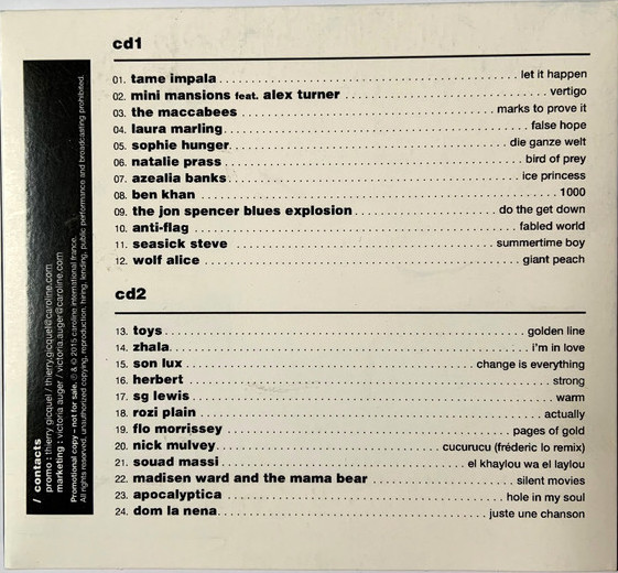 | CD 1: 01. Tame Impala Let It Happen 02. Mini Mansions feat. Alex Turner – Vertigo 03. The Maccabees – Marks To Prove It 04. Laura Marling – False Hope 05. Sophie Hunger – Die Ganze Welt 06. Natalie Prass – Bird Of Prey 07. Azealia Banks – Ice Princess 08. Ben Khan – 1000 09. The Jon Spencer Blues Explosion – Do The Get Down 10. Anti-Flag – Fabled World 11. Seasick Steve – Summertime Boy 12. Wolf Alice Giant Peach CD 2: |