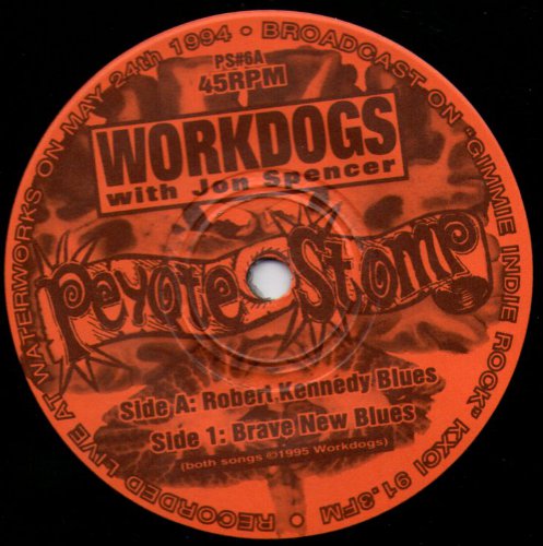 This release is credited as ‘Workdogs with Jon Spencer’ and viewed by the band as an unofficial/bootleg release. The sides of the record are labelled ‘A’ and ‘1’ (even though the Run Out Groove still reads ‘PS6A’ and ‘PS6B’). The Jon Spencer Blues Explosion album Mo’ Width features a track titled Rob K (Rob K is President on the re-release) on which he performs as a preacher and Jon Spencer has recorded with Rob K on several Workdogs records. Signed Copy photo by Thick Syrup Records. |
