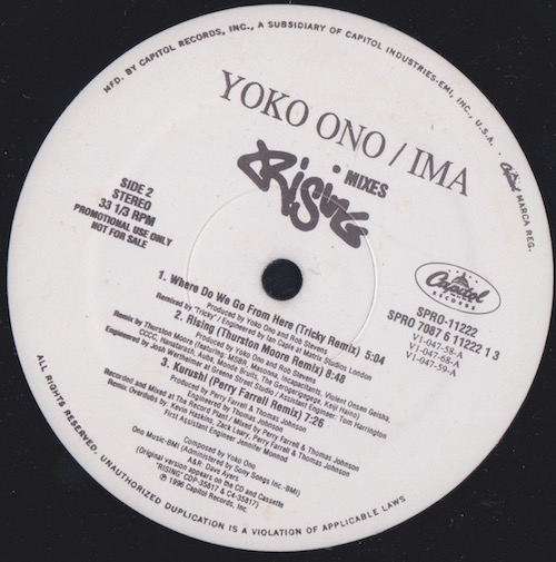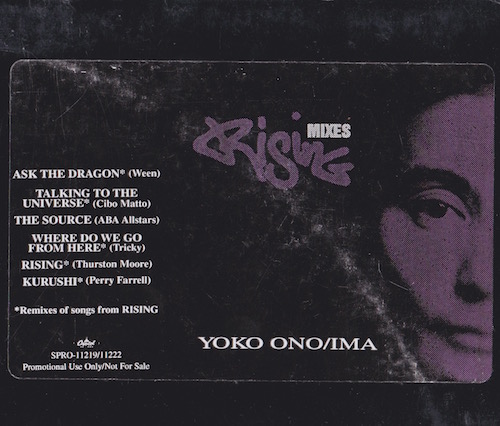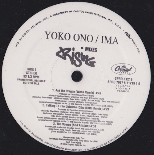 A1. Ask The Dragon (Ween Remix) Music/Lyrics: Yoko Ono © Ono Music (Administered by Sony Songs, Inc.) Produced: Yoko Ono and Rob Stevens Performed: Yoko Ono and IMA Vocals: Yoko Ono IMA: Acoustic/Electric Guitars/Keyboards/Bass/Background Vocals: Sean Ono Lennon Bass/Acoustic and Electric Guitars/Drums: Timo Ellis Drums/Bass/Percussion: Sam Koppelman Mixed: Andrew Weiss, Greg Frye and Ween @ Graphic Sound Featuring: Additional Vocals: Gene Ween Guitar: Dean Ween Bass/Keyboards: Andrew Weiss “Ween appears courtesy of Elektra Entertainment” Run Time: 4:49 A2. Talking To The Universe (Cibo Matto Remix) A3. The Source (ABA Allstars) B1. Where Do We Go From Here (Tricky Remix) B2. Rising (Thurston Moore Remix) B3. Kurushi (Perry Farrell Remix) |