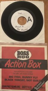 “The tour not only provided a recording locale for the most of the Action Box double 7”, but it also supplied part of the inspiration. The conversation becomes more heated as we verge onto a subject Boss Hog are very fond of: sleaze. Self-proclaimed experts in the subject, the group gets excited and begins talking over each other to explain the origins of the Action Box. Charlie, an expert on all things concerning action, begins.