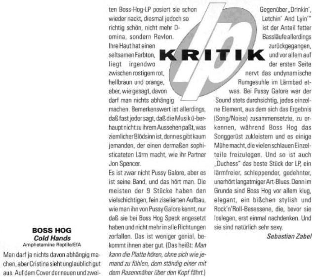 | Review of Boss Hog album Cold Hands from February 1991 issue of Spex magazine. |