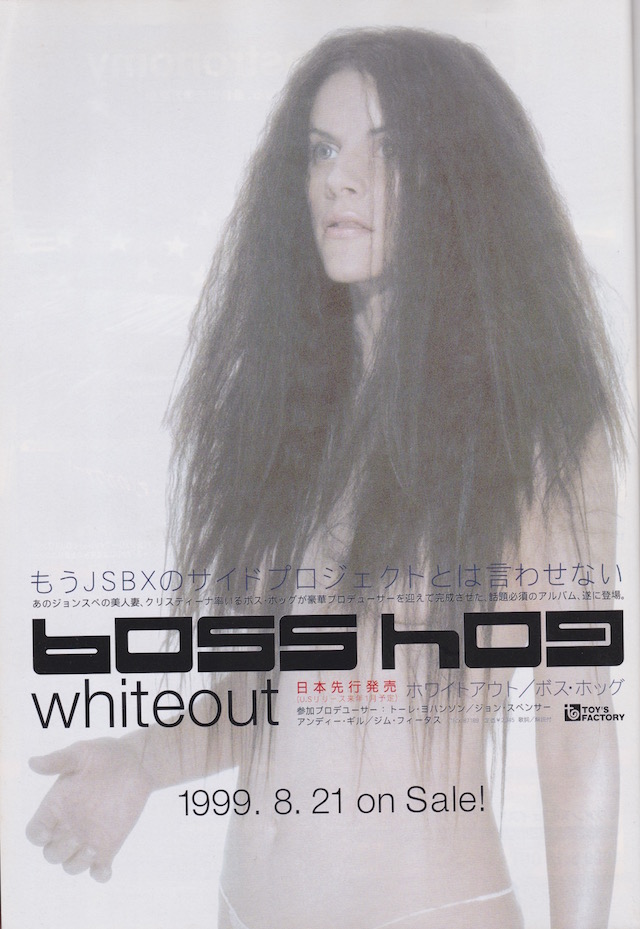 | Two slight variations of the same full-page advert for the Boss Hog album Whiteout from Japanese magazines, the second image is from Crossbeat (September 1999) which also includes an interview, review and review of The Jon Spencer Blues Explosion at Fuji Rock Festival, Naeba, Japan (31 July 1999). |