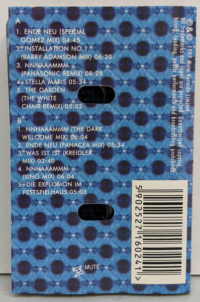 | 01. Ende Neu (Special Gomez Mix) Original Release: Ende Neu Writers: Bargeld/Chudy/Hacke/Einheit Recorded/Produced: Jon Caffery and Einsturzende Neubauten Published: Freibank Remix: Jon Spencer at Greene Street Studio, New York Engineer: Scott Harding 02. Installation No.1 (Barry Adamson Mix) 03. Nnnaaammm (Panasonic Remix) 04. Stella Maris 05. The Garden (The White Chair Remix) 06. Nnnaaammm (The Dark Welcome Mix) 07. Ende Neu (Panacea Mix) 08. Was Ist Ist (Kreidler Mix) 09. Nnnaaammm (Xing Mix) 10. Die Explosion Im Festspielhaus |