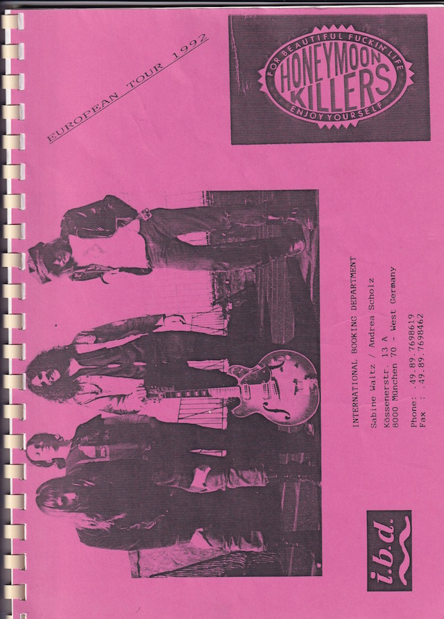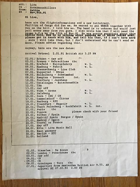 | Tour itinerary (full book but only cover and tour dates shown) and fax listing Honeymoon Killers European tour dates in January and February 1992 with Judah Bauer and Russell SiminsVIEW: Honeymoon Killers – European Tour Poster (January – February 1992) |