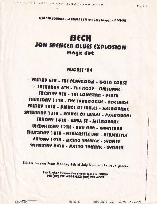 Tour poster for The Jon Spencer Blues Explosion shows with Beck (headlining) and Magic Dirt in Australia 5 – 20 August 1994.