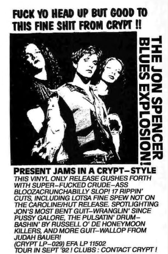 nb. images also show Crypt Records advert from Spex magazine (May 1992) VIEW: The Jon Spencer Blues Explosion – Crypt Style Pressings During an interview with Fiz magazine (issue #5) Jon Spencer speaks about the various editions of the first album and states that “if you have to buy one, buy the Crypt record – it’s our record.” Extract from Vertigozine interview: “Jon: “Crypt Style is like a variation of the first record. Tim Moran*, the guy that runs Crypt picked the songs and the sequencing and I endorse theremin, so I had them out on Caroline Records in the U.S.”” – Vertigozine.co.uk *Crypt Records owner is Tim Warren not ‘Tim Moran’ as printed in the interview. This is one version of the first album all of which have slightly different running orders and tracklistings. The tracks on this release come from recording sessions with Kramer (July 1991) and Steve Albini (November/December 1991). The Shirt Jac single was also recorded during a Steve Albini sessions. The vinyl edition of Crypt Style includes non-CD tracks: Twentynine, What To Do and 40lb Block of Cheese but ommits Maynard Ave., Write A Song, Eye To Eye and The Vacuum of Loneliness. The first album was available as A Reverse Willie Horton, Crypt Style (CD / LP), Crypt Style [25 Tracks / Japan], The Jon Spencer Blues Explosion (CD / CASSETTE / LP) and on 10 August 2010 Shout! Factory released a 38-track compilation titled Year One which takes tracks from all of the early releases. VIEW: The Jon Spencer Blues Explosion – First Album Tracks / Running Order Thanks to Peter for all the images. |