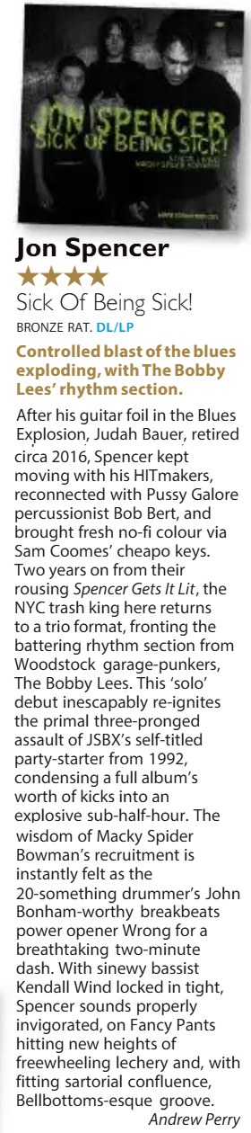 moving with his HITmakers, reconnected with Pussy Galore percussionist Bob Bert, and brought fresh no-fi colour via Sam Coomes’ cheapo keys. Two years on from their rousing Spencer Gets It Lit, the NYC trash king here returns to a trio format, fronting the battering rhythm section from Woodstock garage-punkers, The Bobby Lees. This ‘solo’ debut inescapably re-ignites the primal three-pronged assault of JSBX’s self-titled party-starter from 1992, condensing a full album’s worth of kicks into an explosive sub-half-hour. The wisdom of Macky Spider Bowman’s recruitment is instantly felt as the 20-something drummer’s John Bonham-worthy breakbeats power opener Wrong for a breathtaking two-minute dash. With sinewy bassist Kendall Wind locked in tight, Spencer sounds properly invigorated, on Fancy Pants hitting new heights of freewheeling lechery and, with fitting sartorial confluence, Bellbottoms-esque groove.
